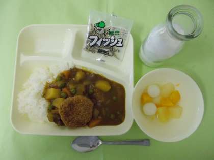 【カツカレーライス、牛乳、フルーツ白玉、ミニフィッシュ】
