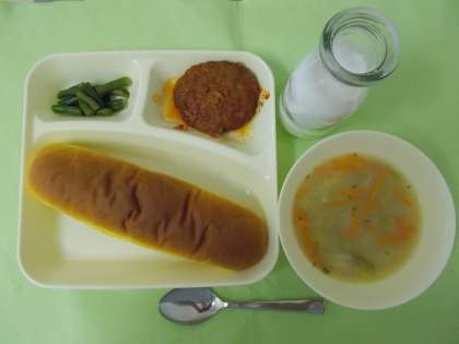 煮こみハンバーグ、コーンスープ、三度豆のサラダ】