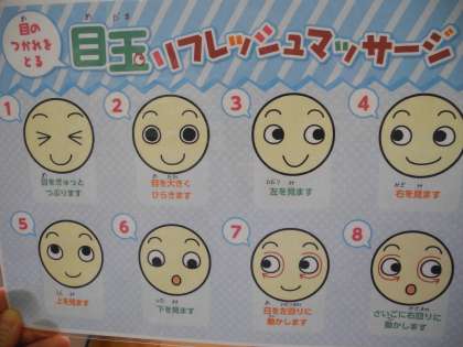 普段の生活を振り返り、目の疲れをとる「目玉リフレッシュマッサージ」をしました。それから、視力検査をしました。