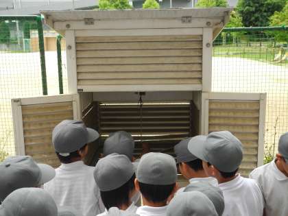 理科の単元「1日の天気と気温」で、1日の気温を調べる活動をしています。初めて見る百葉箱に児童は興味津々でした。