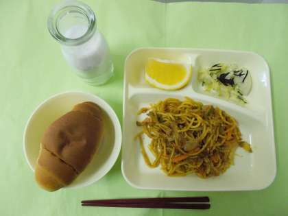 【ミニ黒糖パン・牛乳・カレースパゲッティ・キャベツのひじきドレッシング・河内ばんかん】
