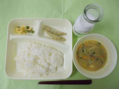 【ごはん・牛乳・きびなごてんぷら・みそ汁・えんどうの卵とじ】