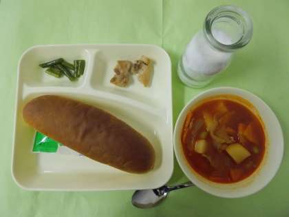 【コッペパン・マーガリン・牛乳・鶏肉のバジル焼き・ケチャップ煮・三度豆のソテー】