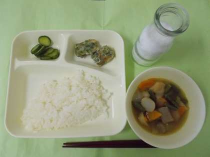 【ごはん・牛乳・ちくわのいそべあげ・鶏肉とさといもの煮もの・あっさりきゅうり】