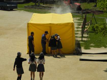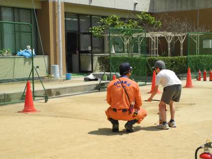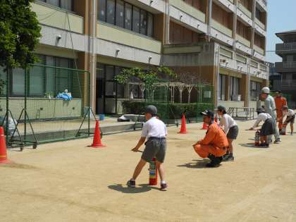 6年生は、消火訓練(水消火器)、煙体験、可搬式ポンプ庫の見学を行いました。