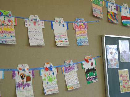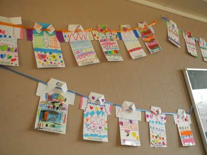 1年生は、図工で「おしゃれなシャツ」を作りました。教室に掲示しています。