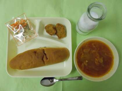 【レーズンパン・牛乳・一口トンカツ・ミネストローネ・アーモンドフィッシュ】