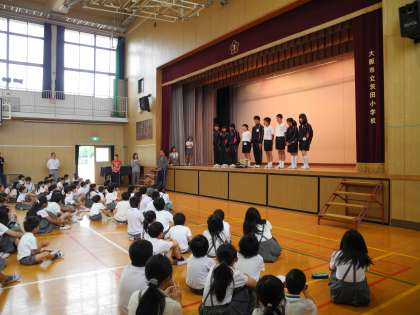 今日、明日の2日間、茨田中学校から2年生9名が職場体験に来ました。写真は、児童集会で自己紹介をしている様子です。