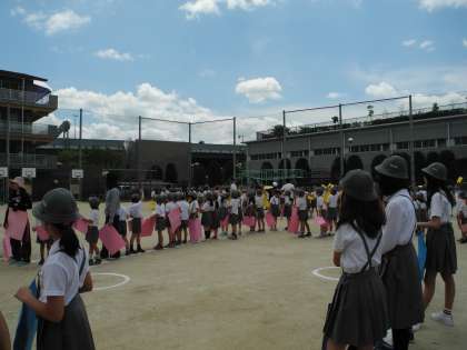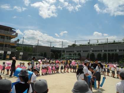 ヘリコプターが到着し、子どもたちは色画用紙を頭上に持って、人文字を撮影しました。