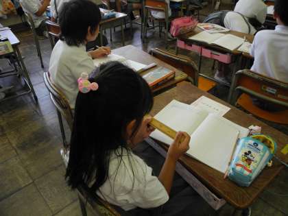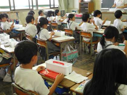 竹ものさしの使い方について、はがきの長さを測って学習しました。