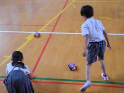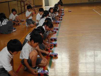 電気のはたらきで直列回路、へい列回路の学習をししています。今日は、理科の時間に作ったモーターカーを体育館で実際に走らせました。