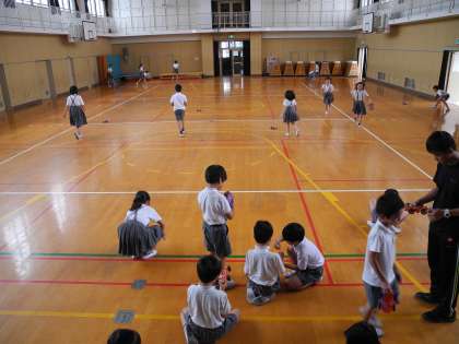 友だちと競走する子どもたちもいました。実験を楽しみにしている児童が多いです。