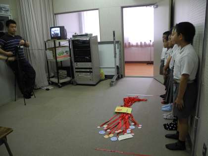 今日は、3年1組「ひもくじ」、4年2組「ボーリング」、5年1組「マメつまみ皿うつし」、6年2組「シルエットクイズ」のコマーシャルを放送室のスタジオから教室のテレビに流しました。