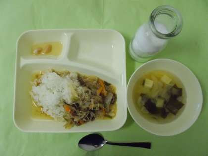 【牛丼・すまし汁・大福豆の煮もの・牛乳】