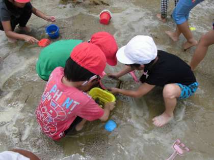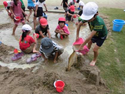 山を作っている子、砂を掘って水をためている子、お団子を作っている子など、思い思いに楽しんで活動することができました。