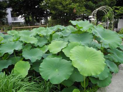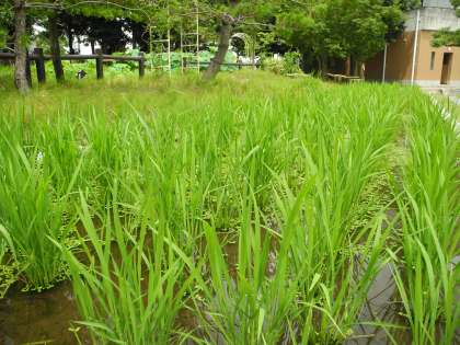 田んぼの稲とレンコン畑の蓮の葉が大きくなっています。