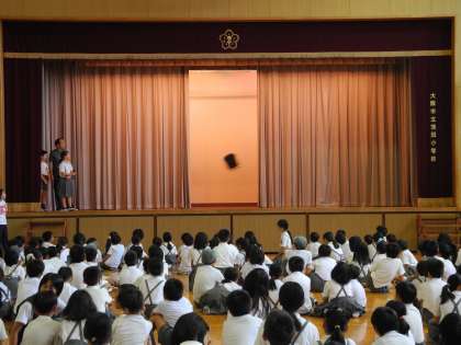 今日の児童集会は、舞台のカーテンの間から何が見えるのか当てる