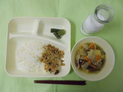 【ごはん・牛乳・豚肉とじゃがいもの煮もの・オクラの梅風味・紅ざけそぼろ】