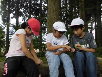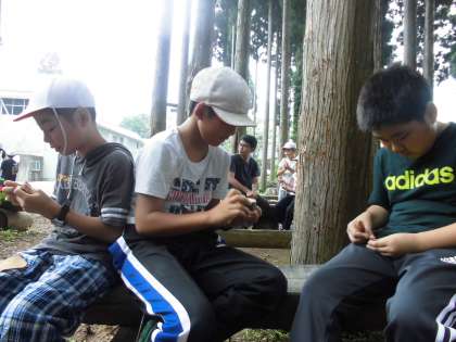 2日目の午前中、ウッドクラフト(年輪ペンダント)を作りました。