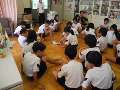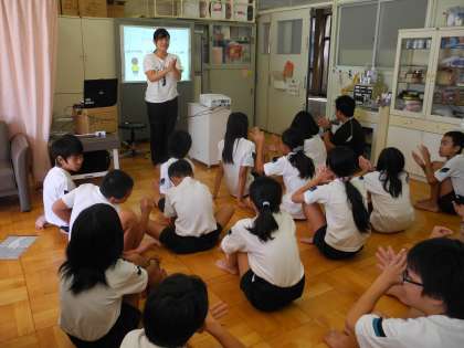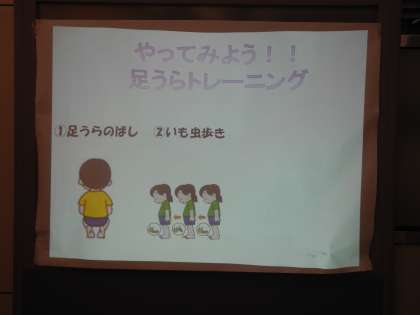 写真は、足うらトレーニングとして足の指だけを使ってティッシュを渡しているところです。どのクラスも自分の足に興味をもって観察をしていました。