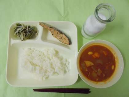 【ごはん・牛乳・さけのバジル焼き・大豆とごろごろ野菜のトマト煮・三度豆ともやしのサラダ】