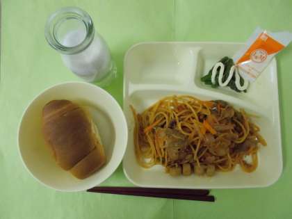 【ミニ黒糖パン・牛乳・イタリアンスパゲッティ・グリーンアスパラガスのサラダ】