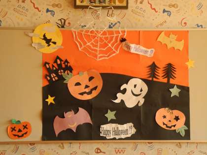 図書ボランティアの方が、読書スペースにハロウィーンの