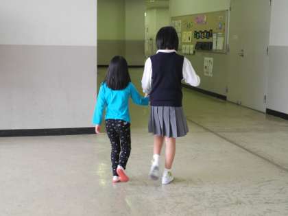 5年生は、園児に優しく声をかけたり案内したりしていました。