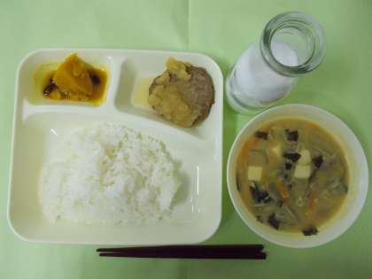 【ごはん・牛乳・和風おろしハンバーグ・みそ汁・かぼちゃのいとこ煮】