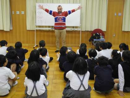 ネイティブスピーカーを招いて、1,2年生が英語学習をしました。