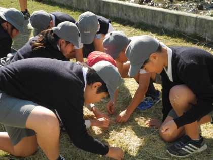 脱穀をした後、落ちた米粒を子どもたちは、「もったいない!」と
