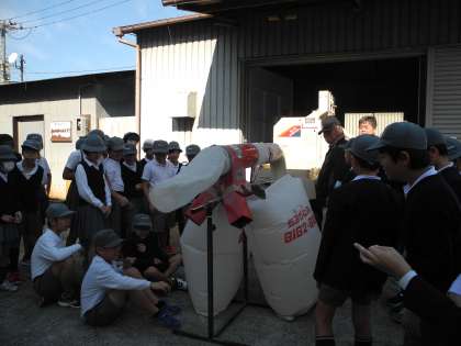 そのあと、地域の方の農機具が置いている場所に移動して、籾摺り