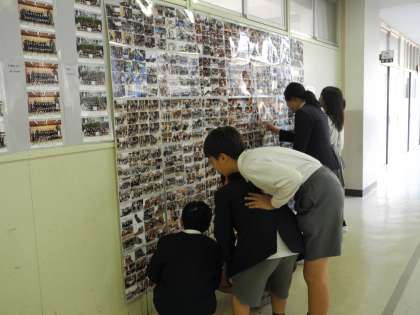 修学旅行の写真ができたので、廊下に貼り出しています。
