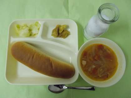 【鶏肉のカレー風味焼き・ミネストローネ・サワーキャベツ・黒糖パン・牛乳】