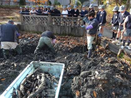 今日、すくすくの森のレンコン畑でPTAや地域の方がれんこんを収穫するのを見せていただきました。