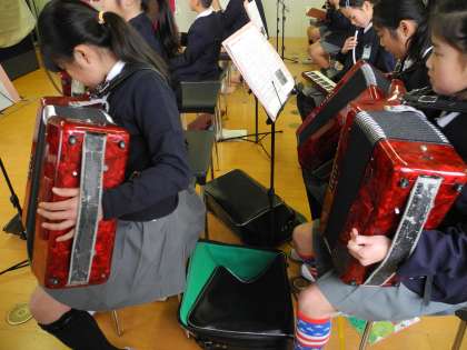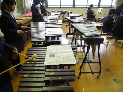 子どもたちは、担当する楽器に分かれ、楽譜を見ながら友だちと一生懸命に取り組んでいました。