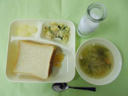 【ほうれん草のグラタン・スープ・和梨(缶づめ)・食パン・マーマレード・牛乳】