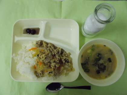 【他人丼・みそ汁・黒豆の煮もの・牛乳】