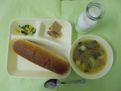 【豚肉のオイスターソース焼き・糸寒天のスープ・ピリ辛あえ・黒糖パン・牛乳】