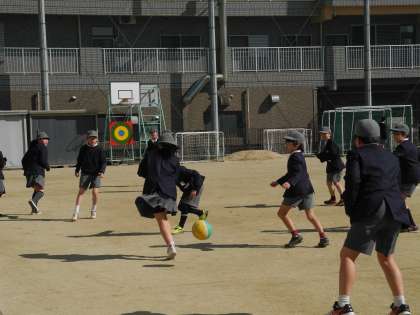 昼休みの運動場は、あちこちでドッジボールをしています。