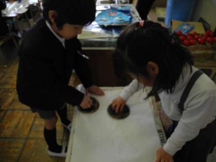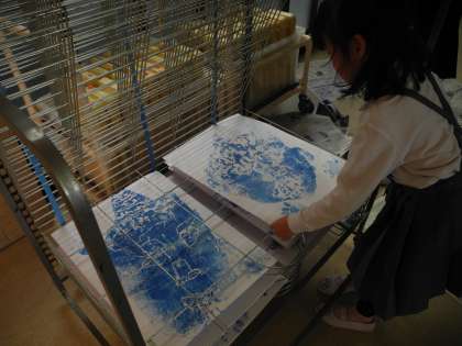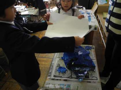 画用紙でで「おに」を作り、ローラーに赤や青などのカラーインクを