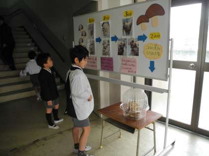 職員が育てている「しいたけ」を、給食室前に展示しました。