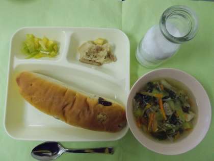 【中華おこわ、卵スープ、キャベツのオイスターソースいため、レーズンパン、牛乳】