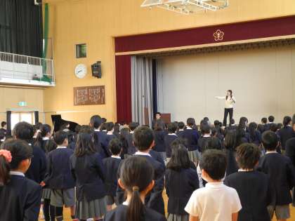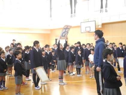 今週木曜日の「卒業お祝いの会」に向けて、1年生から5年生が呼びかけや歌の練習をしました。