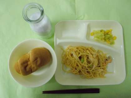 【さけのクリームスパゲッティ、キャベツとコーンのサラダ、ミニ黒糖パン、牛乳】