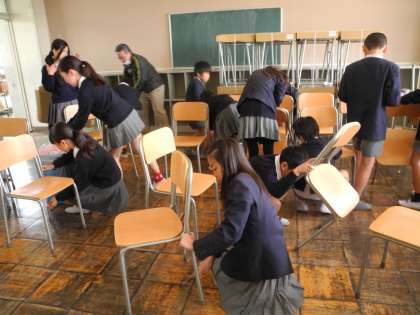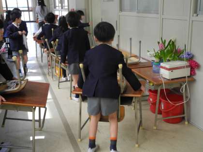 6年生の教室に新しい机と椅子が入りました。4年生は、梱包