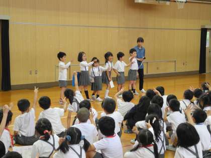 まず、1・2年生全員が体育館に集合し、グループになってなかよし
