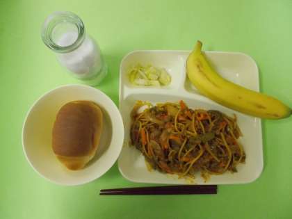 【カレースパゲッティ・キャベツのサラダ・バナナ・ミニ黒糖パン・牛乳】