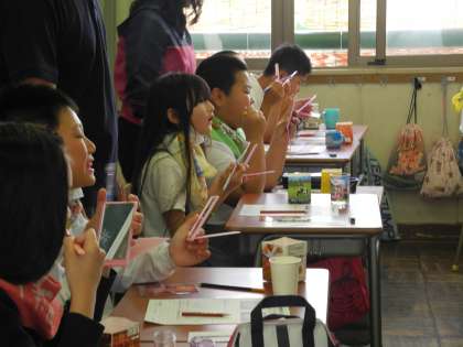 染色液で歯垢がピンクに染まった自分の歯を鏡で見ながら、子どもたちは普段の歯の磨き方について振り返っていました。