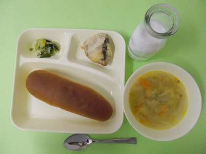 【かつおのガーリックマヨネーズ焼き・スープ・レタスのサラダ・黒糖パン・牛乳】